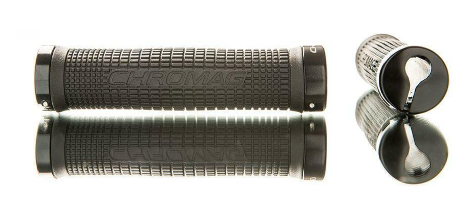 Chromag Squarewave Lock On Grips w/ Clamps. The gentle bulge fits nicely in the cup of the hand to promote long ride comfort. The one-side flange can be oriented to either inside or outside of the bar. A soft 25a durometer is combined with a proprietary additive for a combination of tackiness and durability