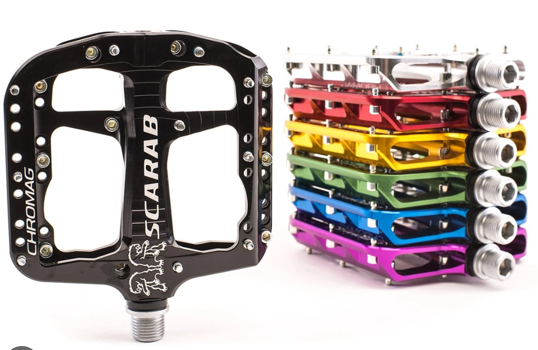 Whether you're a park-rat or spend the weekends shredding the secret spot, the Chromag Scarab offers more room to rip! At 110 x 105mm, the Chromag Scarab offers one of the most spacious platforms available, while its slim profile and chamfered corners keep clearance ample. Chromag's proprietary extrusion and machined design sculpts an ultra thin, true dished profile that is only 13mm at the platforms center and weighs a mere 215 grams per pedal. The custom traction pins are constructed of a hardened steel to withstand the abuse, and feature two height options through a removable washer. Each Scarab pedal includes 42 pin positions for plenty of adjustment options.
